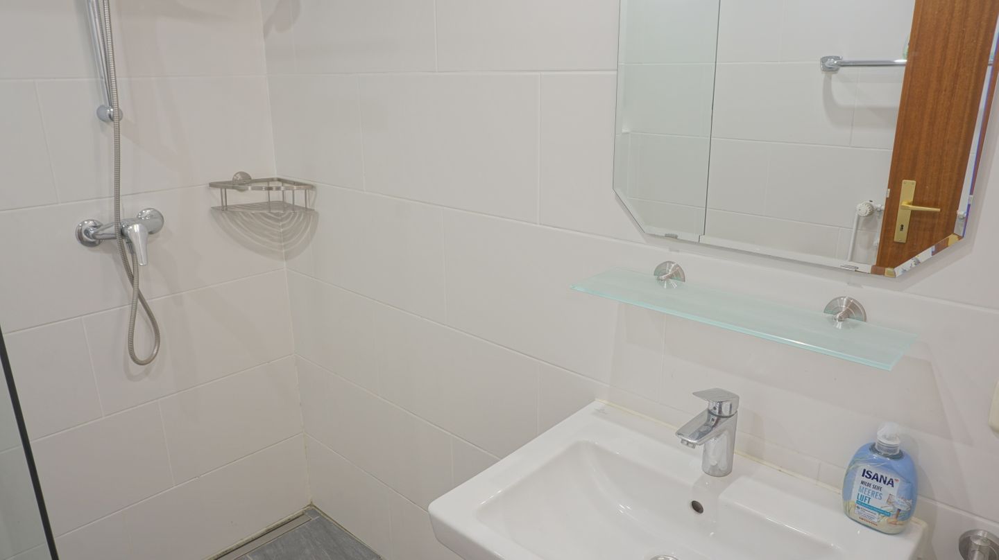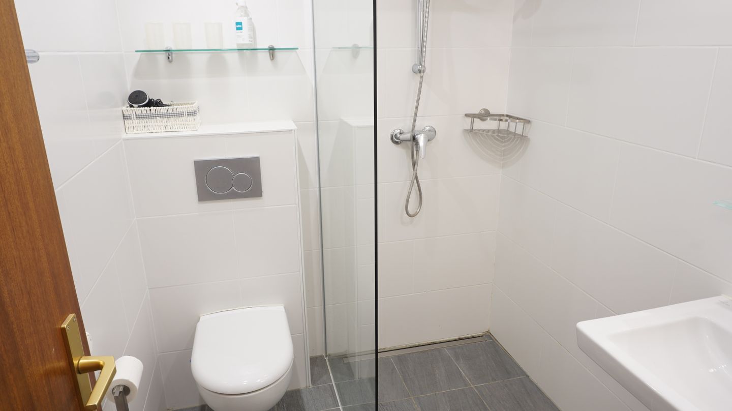 Das Badezimmer verfügt über eine bodengleiche Dusche, WC, Waschbecken, Spiegel und Haartrockner.