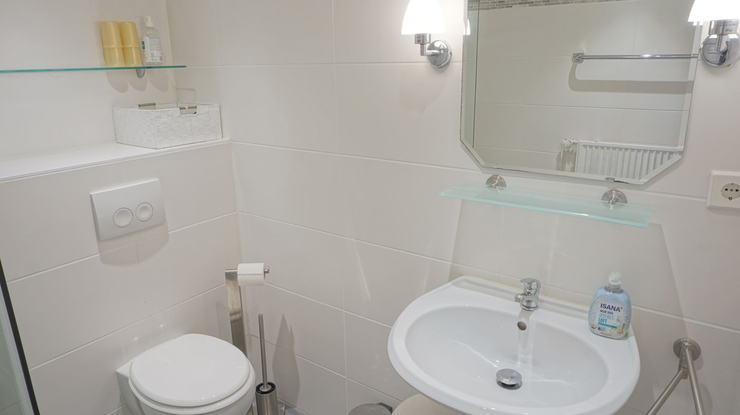 Die Wohnung ist als Nichtraucherunterkunft ausgewiesen und allergikergeeignet. Eine bodengleiche Dusche im Badezimmer, ein Haartrockner, Spiegel und Waschbecken ergänzen die Badezimmereinrichtung.