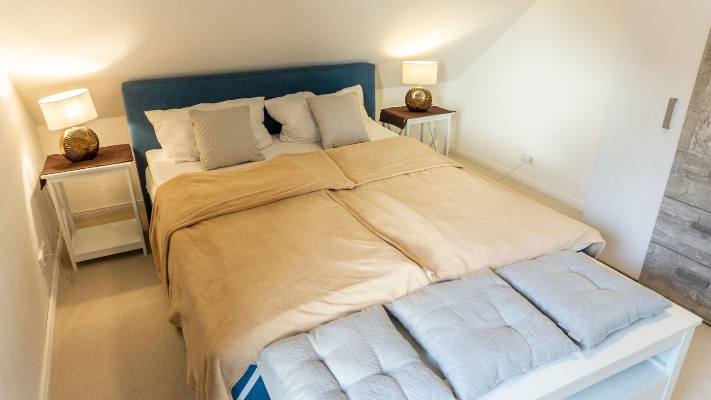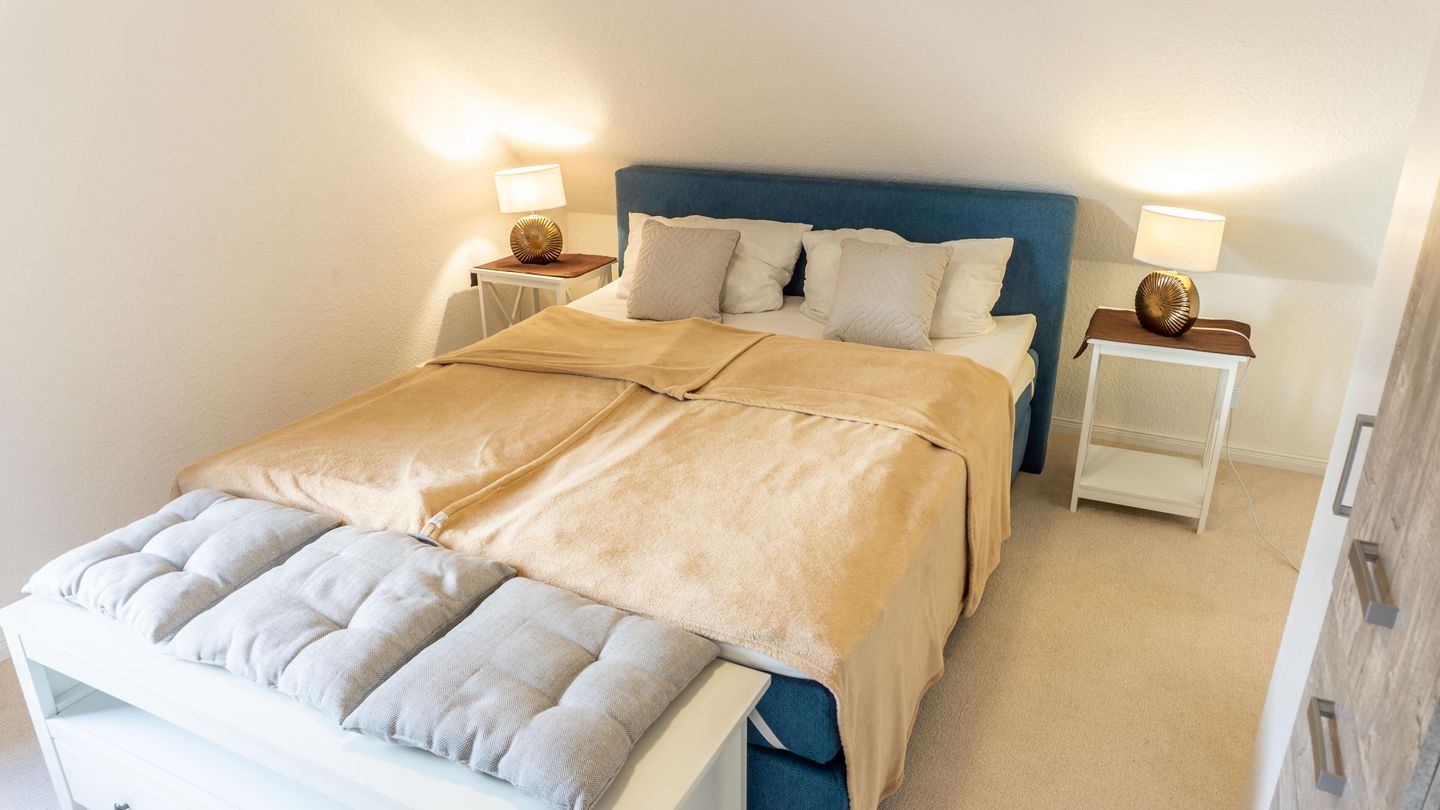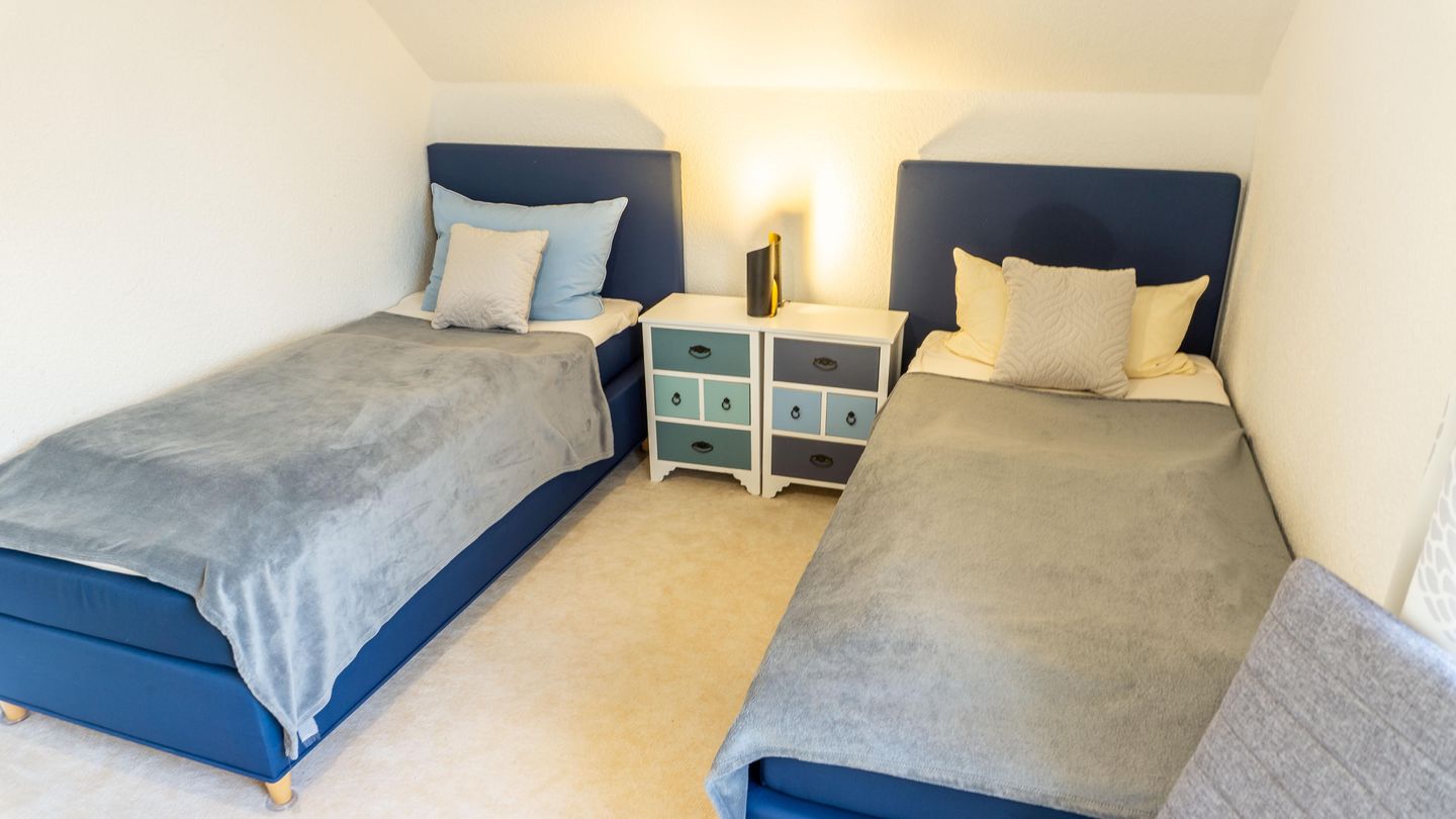 Die Ferienwohnung verfügt über insgesamt vier Zimmer, darunter drei separate Schlafzimmer , die für angenehme Wohnatmosphäre sorgen. Das Einzelbettzimmer ist nur über ein anderes Schlafzimmer zugänglich mit dem Doppelbett 160er Breite. Das 3. Schlafzimmer beherbergt ein großes Doppelbett mit 180er Breite.