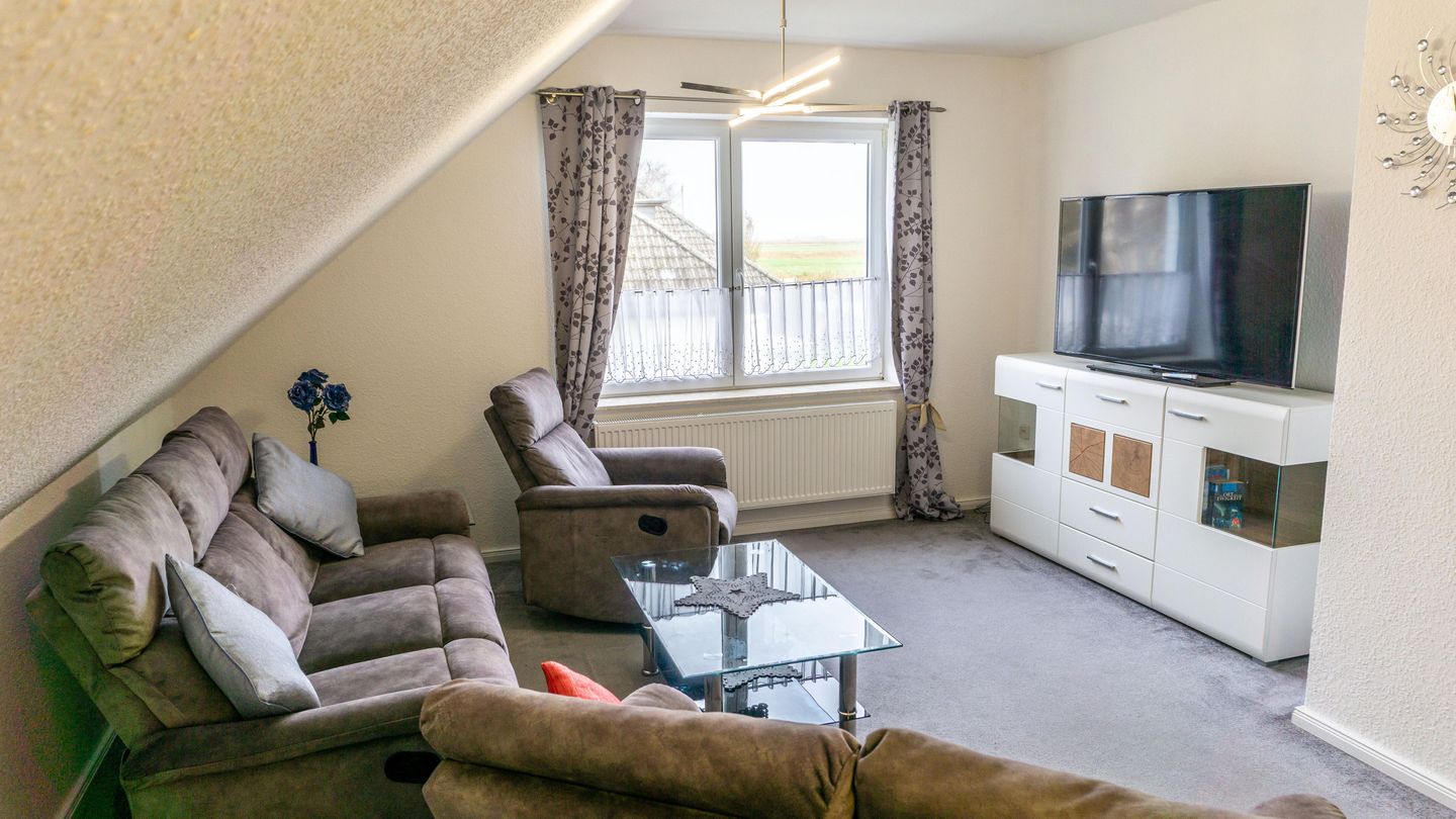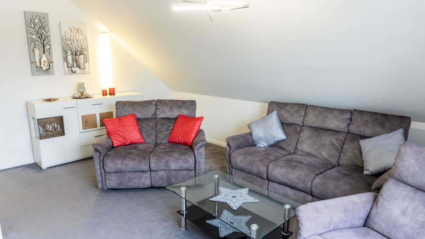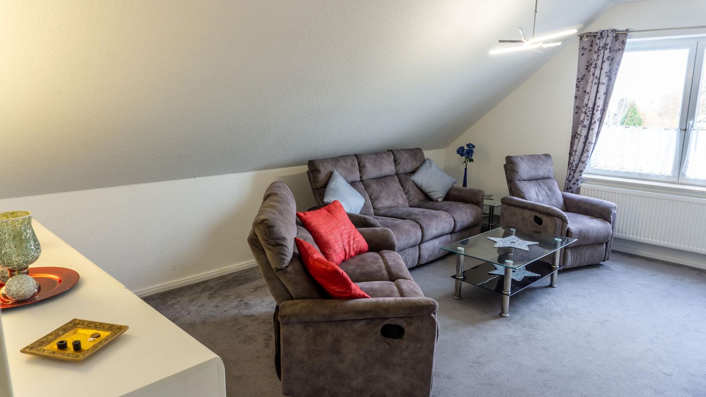Im Wohnzimmer stehen Ihnen eine gemütliche Sofaecke sowie Sessel zur Verfügung – perfekt für gesellige Stunden oder entspannte Abende.