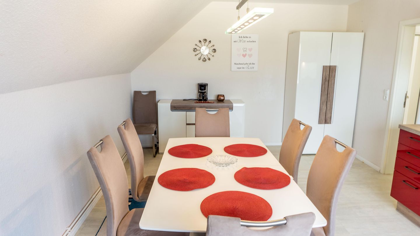 Die Küche ist geschlossen und mit einem Esstisch sowie einer umfassenden Ausstattung versehen. Hier stehen Ihnen Ceranherd, Backofen, Kühlschrank mit Gefrierfach, Mikrowelle, Spülmaschine, Kaffeemaschine und viele weitere Küchengeräte wie Mixer, Wasserkocher, Eierkocher und Toaster zur Verfügung. Sämtliche Küchenutensilien, Geschirr, Besteck sowie Geschirrhandtücher sind in der Erstausstattung enthalten.