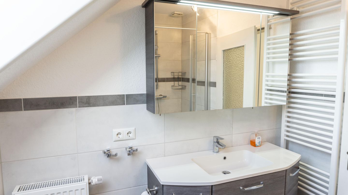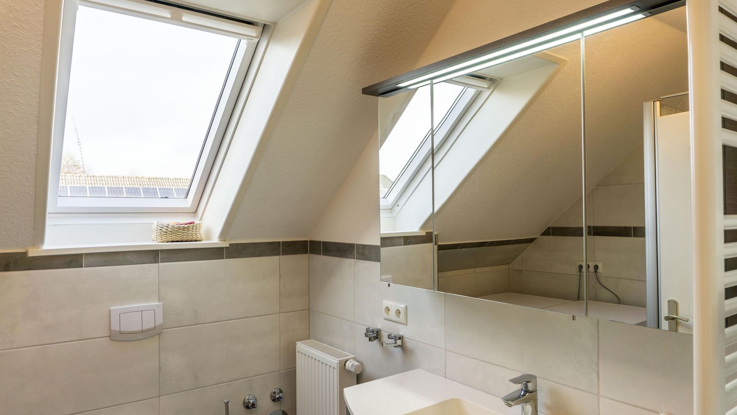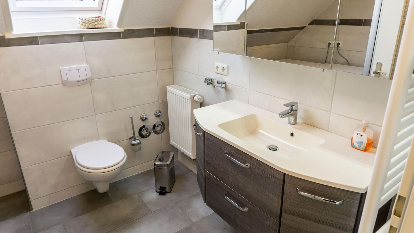 Das Badezimmer ist modern gestaltet und bietet eine bodengleiche Dusche, ein WC, ein Waschbecken, einen großen Spiegel sowie einen separaten Kosmetikspiegel. Praktische Ausstattungen wie Haartrockner und ein Fenster für Tageslicht runden den Komfort ab.