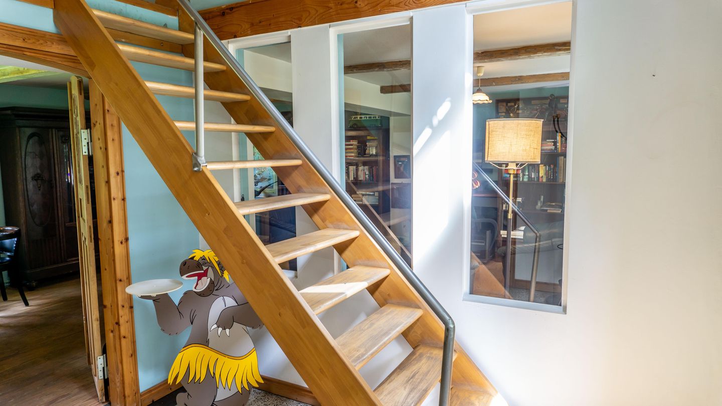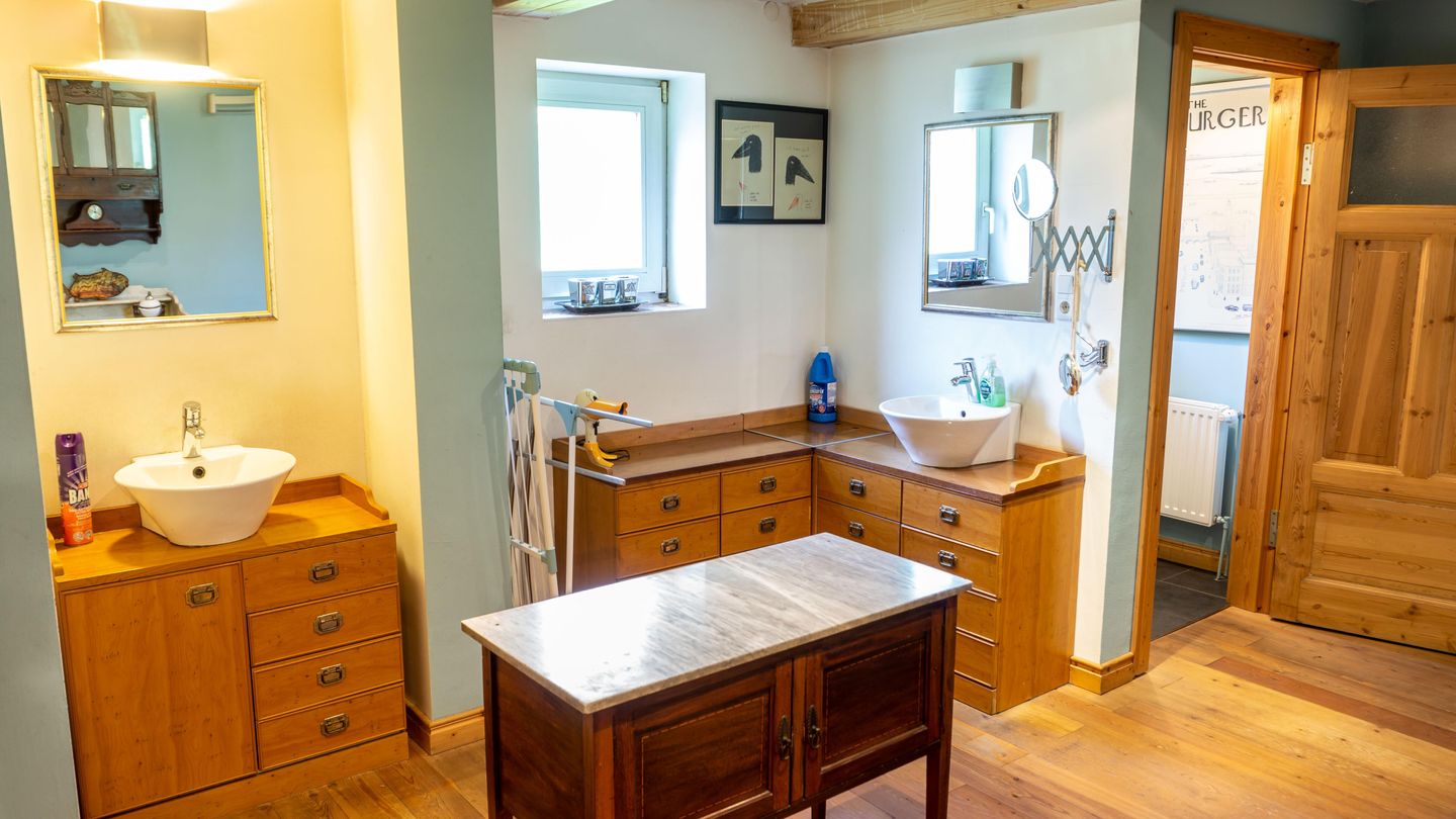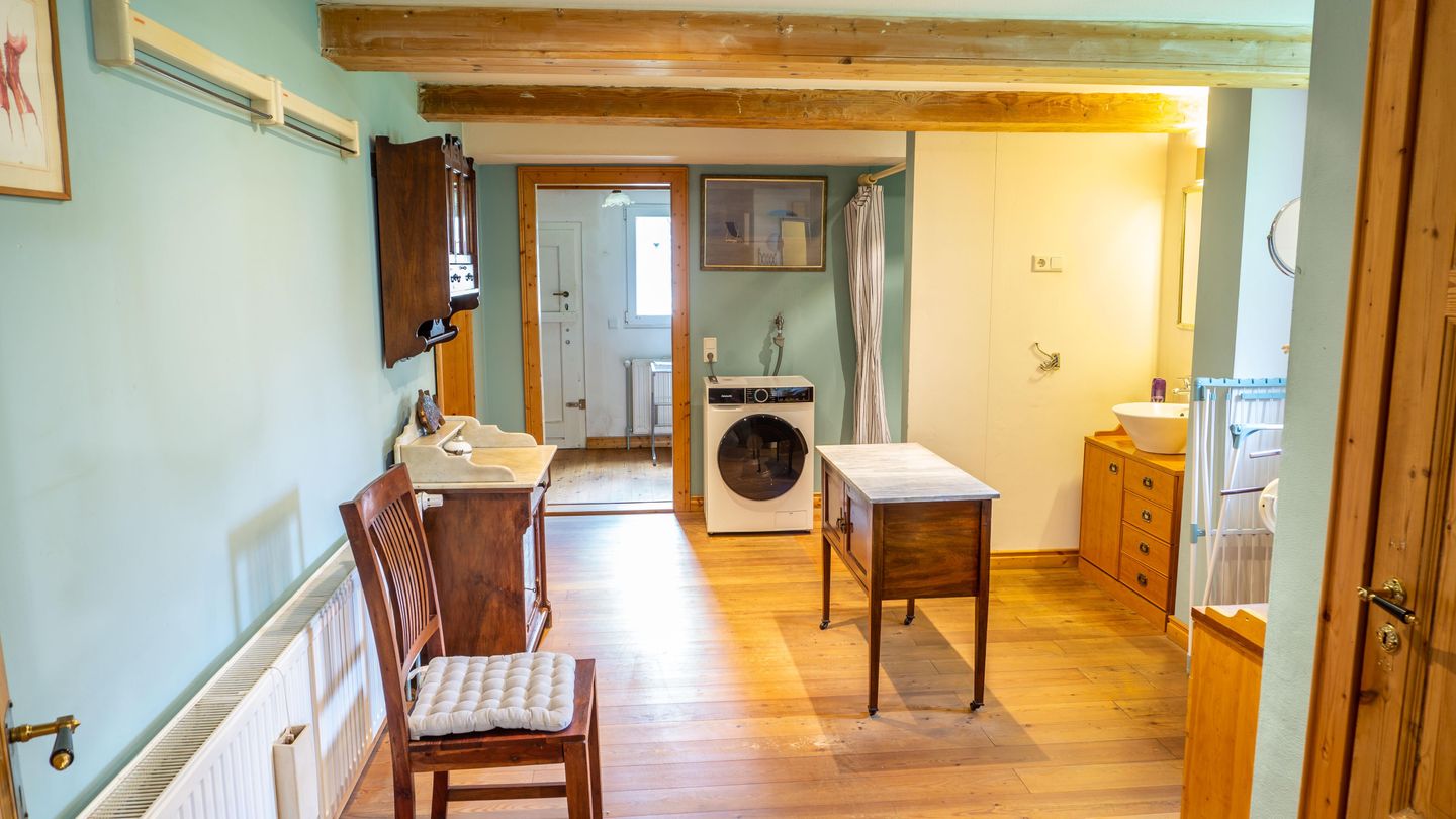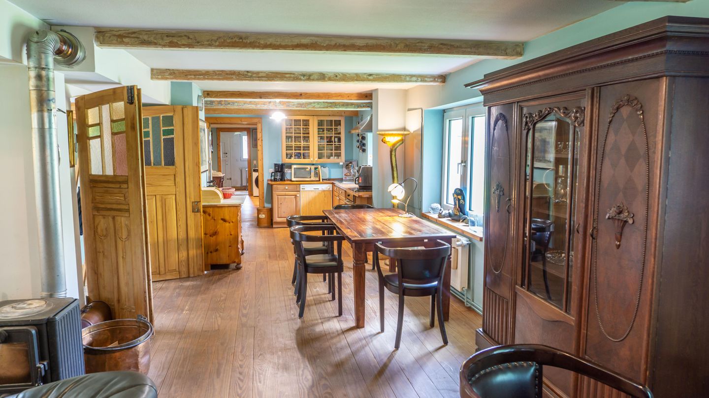 Im Erdgeschoss erwartet Sie ein Wohnbereich mit gemütlicher Sofaecke, Sessel, Esstisch und einem Schreibtisch, der bei Bedarf als Arbeitsbereich genutzt werden kann. Zur Unterhaltung stehen Ihnen zwei Fernseher zur Verfügung. Dank des offenen Grundrisses geht die voll ausgestattete Küche nahtlos in das Wohnzimmer über, sodass Sie auch beim Kochen am Familienleben teilnehmen können. Die Küche ist umfangreich ausgestattet: Backofen, Herd, Kühlschrank, Kaffeemaschine, Kaffee- und Teemaschine sowie sämtliche Küchenutensilien und Geschirr stehen bereit. Ein separat gelegener Essbereich lädt zu gemeinsamen Mahlzeiten ein.