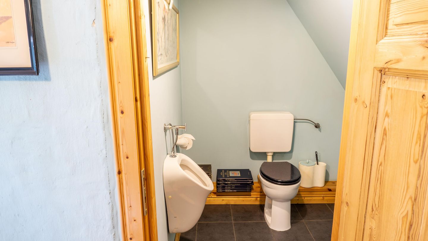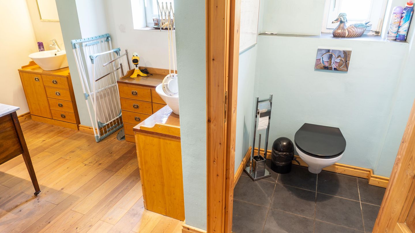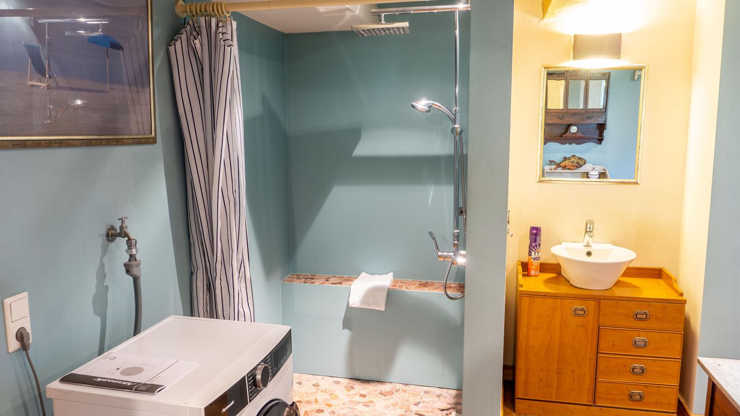 Das Bad verfügt über eine bodengleiche Dusche, Waschbecken, Spiegel sowie ein Fenster für natürliches Licht und frische Luft. Ein separates Gäste-WC ergänzt den Sanitärbereich.