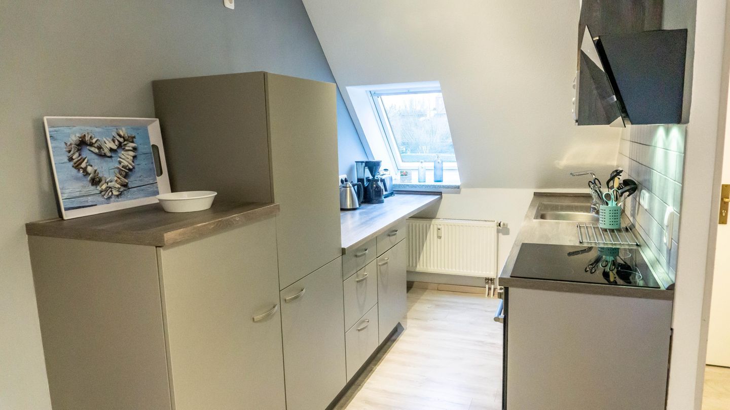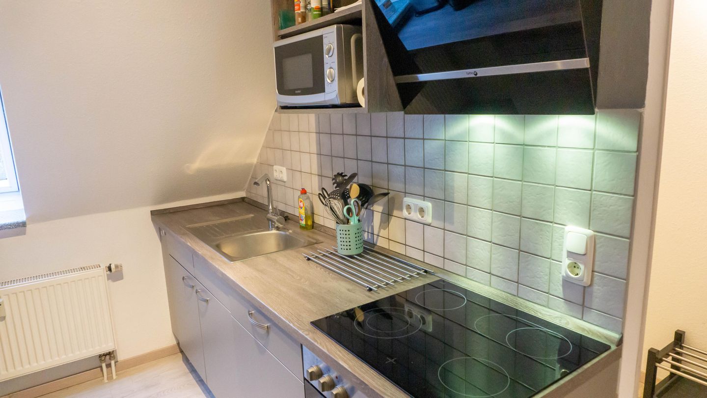 offene Küche mit Geschirrspülmaschine, Mikrowelle, Wasserkocher, Cerankochfeld und Backofen sowie Kühlschrank mit Gefrierfach