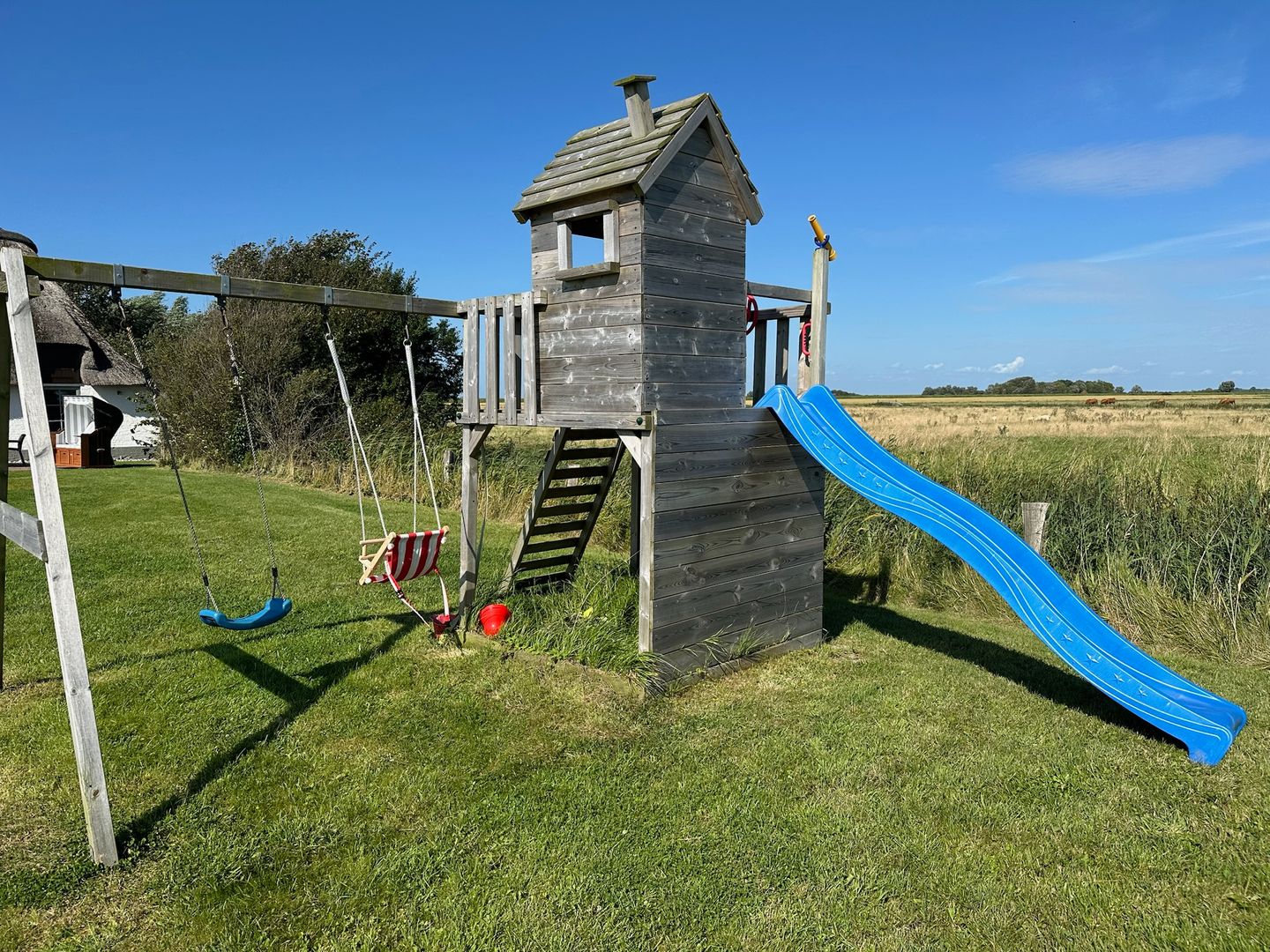 Für Kinder gibt es vielfältige Spielmöglichkeiten: Spielplatz mit Schaukel, Rutsche und Sandkasten sowie Kinderspielzeug.