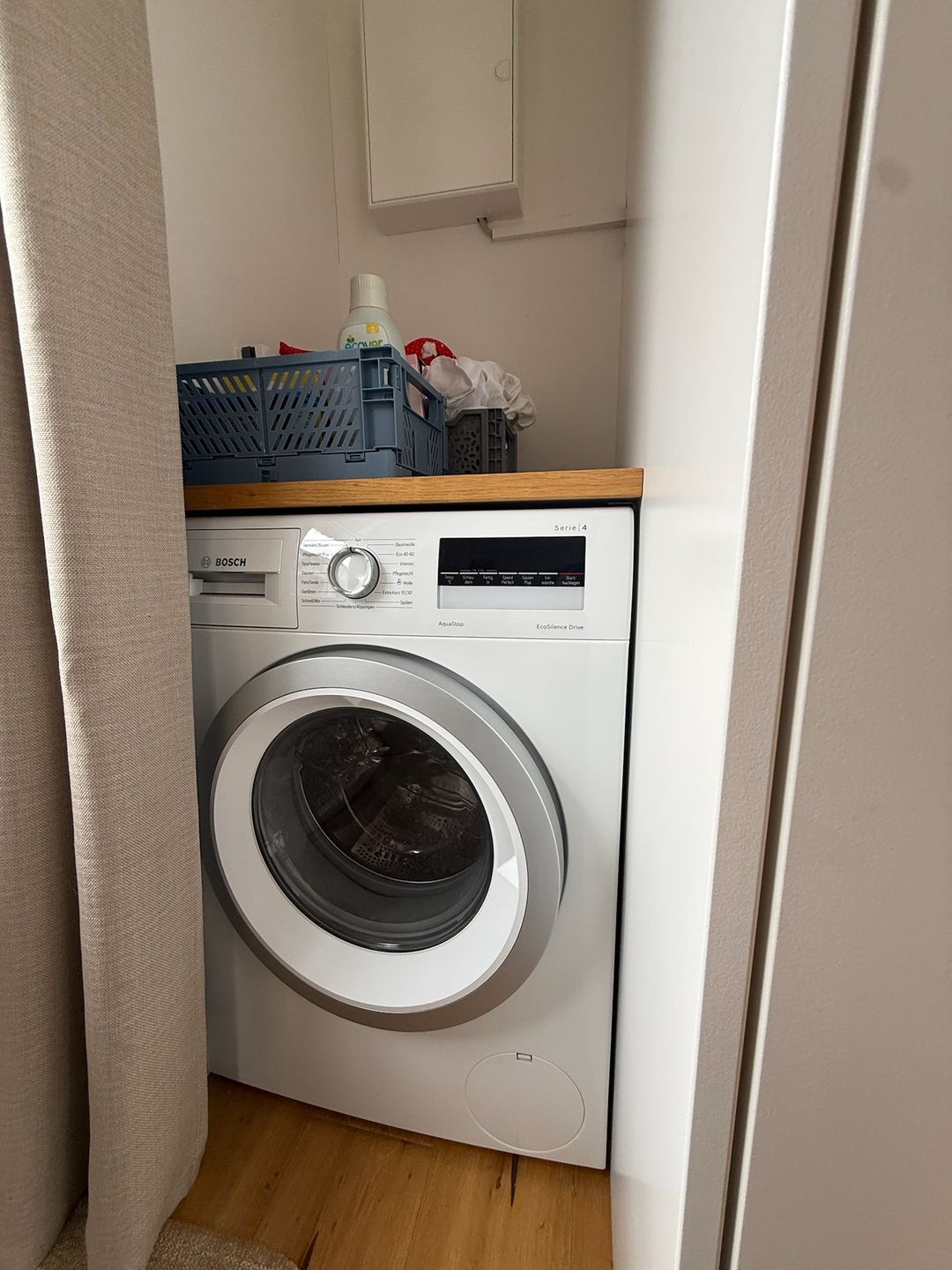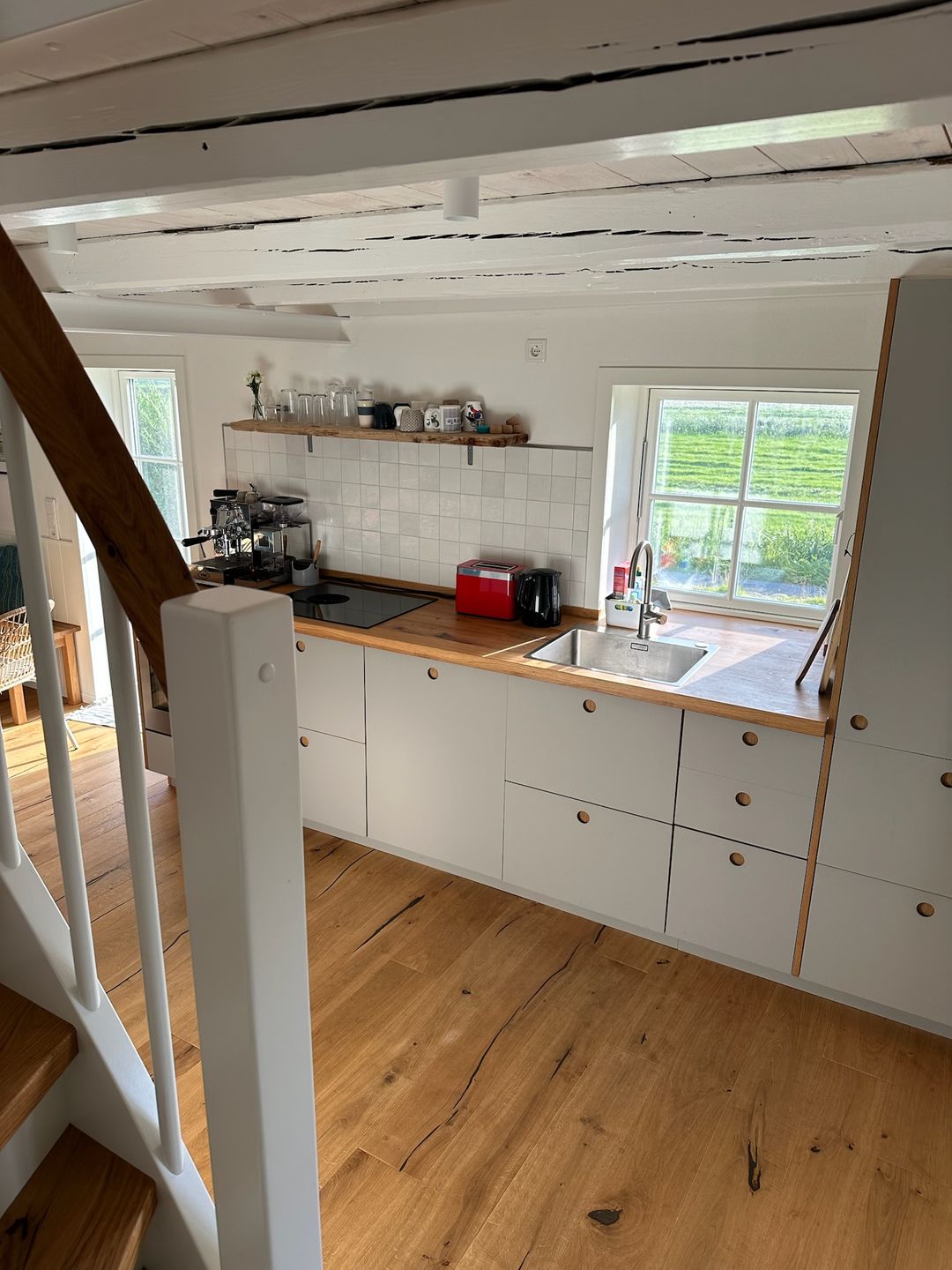 Die offene Küche ist zum Wohnzimmer hin gestaltet und umfassend ausgestattet: Induktionsherd mit Backofen, Kühlschrank mit Gefrierfach, Spülmaschine sowie Kaffeemaschine, Siebträgermaschine, Bialettikanne (Espressokocher), Wasserkocher, Toaster und Mixer. Küchenutensilien, Geschirr und Besteck, Geschirrhandtücher sowie eine Erstausstattung sind vorhanden. Für längere Aufenthalte stehen Waschmaschine (zur Eigennutzung) und Wäscheständer bereit.