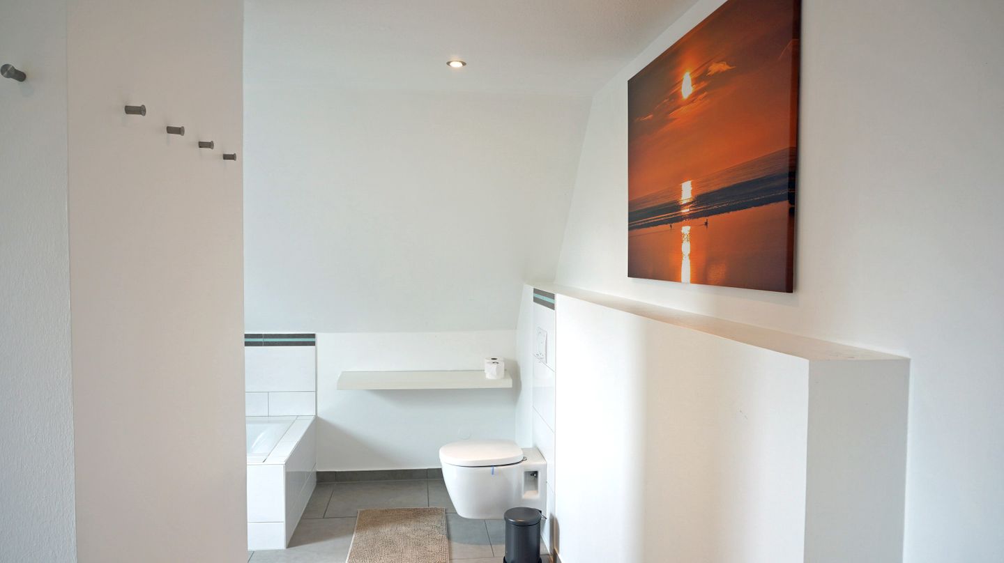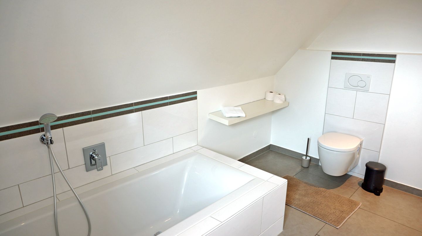 Die 2 Badezimmer sind funktional ausgestattet und bieten mit insgesamt 3 Duschen ( 1x Doppeldusche für 2) , Badewanne, WC, Waschbecken, Spiegel und Haartrockner einen angenehmen Rahmen für den Tagesbeginn oder die Rückkehr nach einem Ausflug. Die Beheizung erfolgt über eine angenehme und komfortable Fußbodenheizung.
