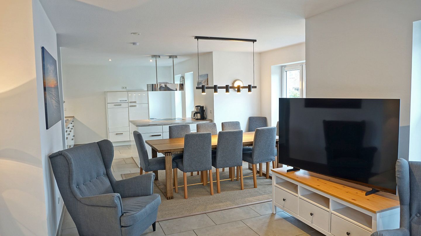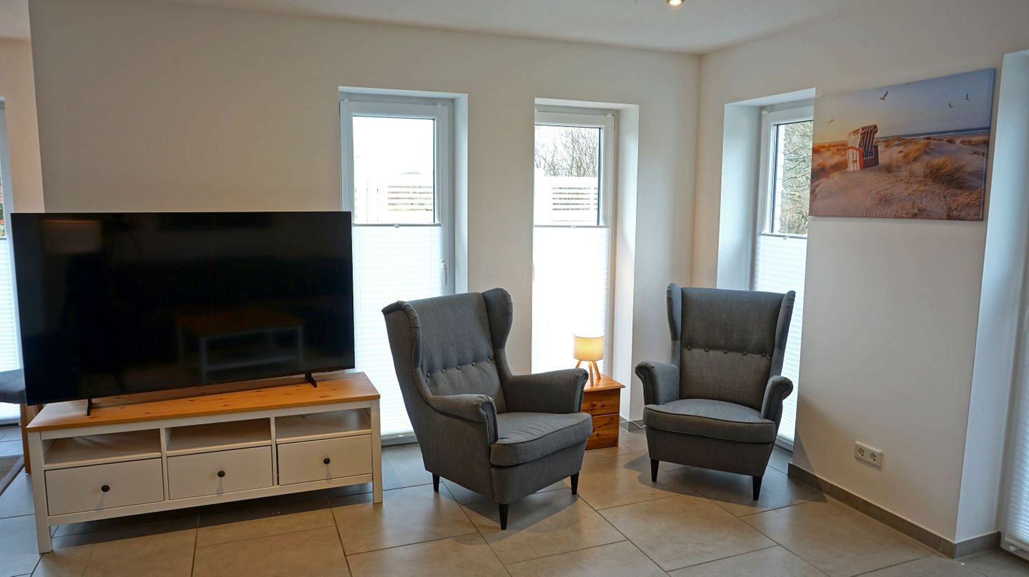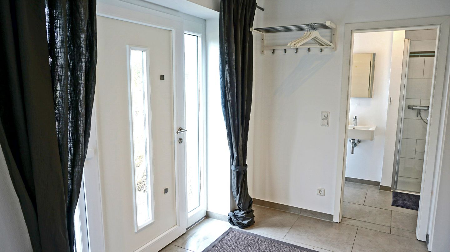 Das Haus erstreckt sich über 3 Etagen und wurde zuletzt 2026 renoviert. Im Wohnbereich schaffen Fliesenböden, eine Sofaecke mit Sofa (Schlafsofafunktion) und Sesseln sowie ein separater Essbereich mit Esstisch eine funktionale und angenehme Wohnatmosphäre. Eine Garderobe und praktische Stauraummöglichkeiten, unter anderem durch eine Kommode, finden sich im Eingangsbereich. Sichtschutz an allen Fenstern sorgt für zusätzlichen Komfort und Privatsphäre. Als Nicht-Raucher-Unterkunft und mit allergikergeeigneter Ausstattung bietet das Sonnenhaus gute Voraussetzungen für einen unbeschwerten Aufenthalt.