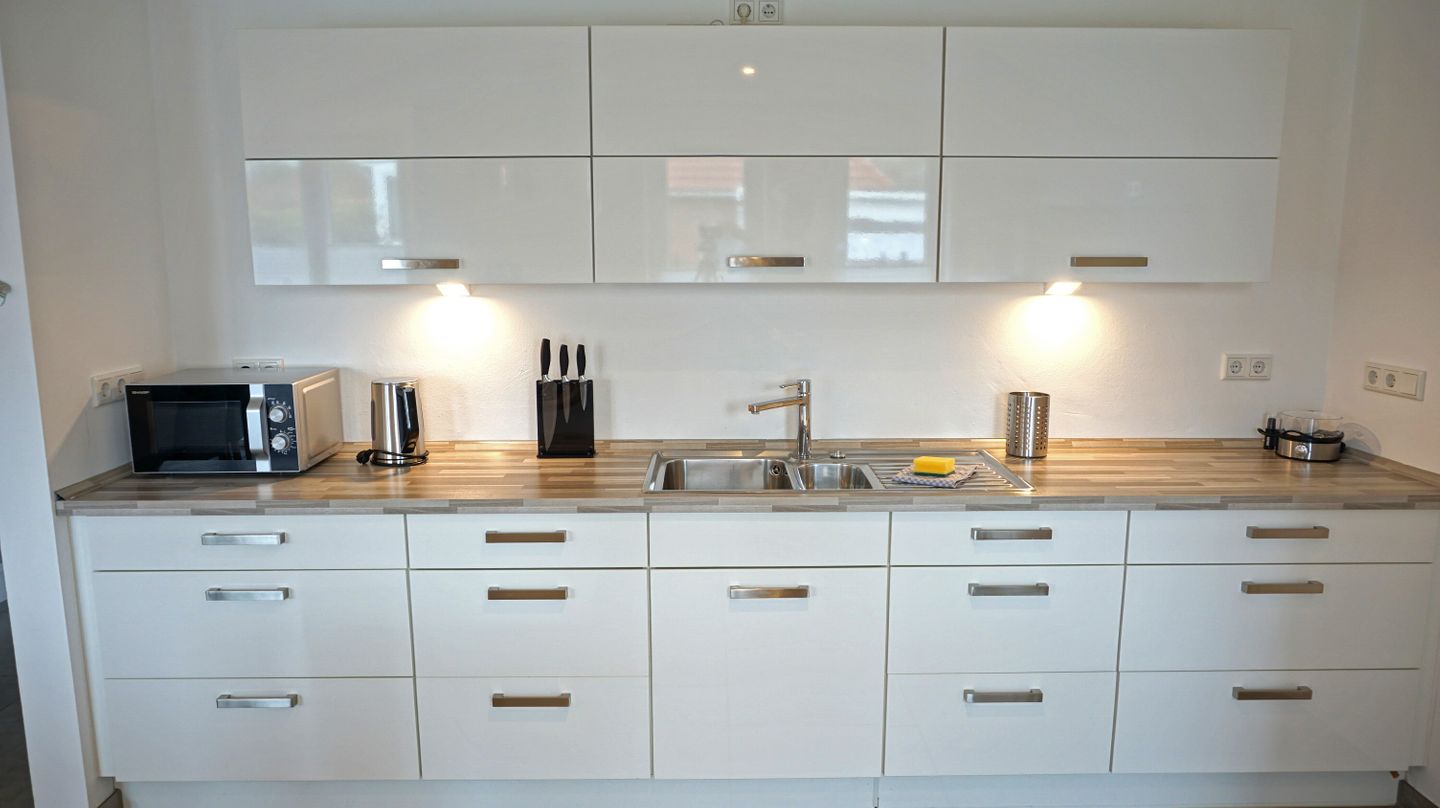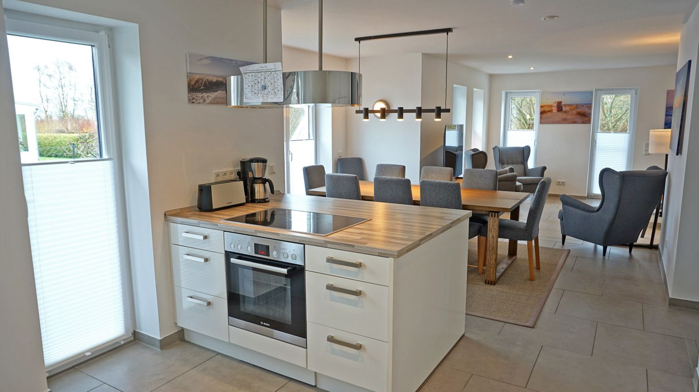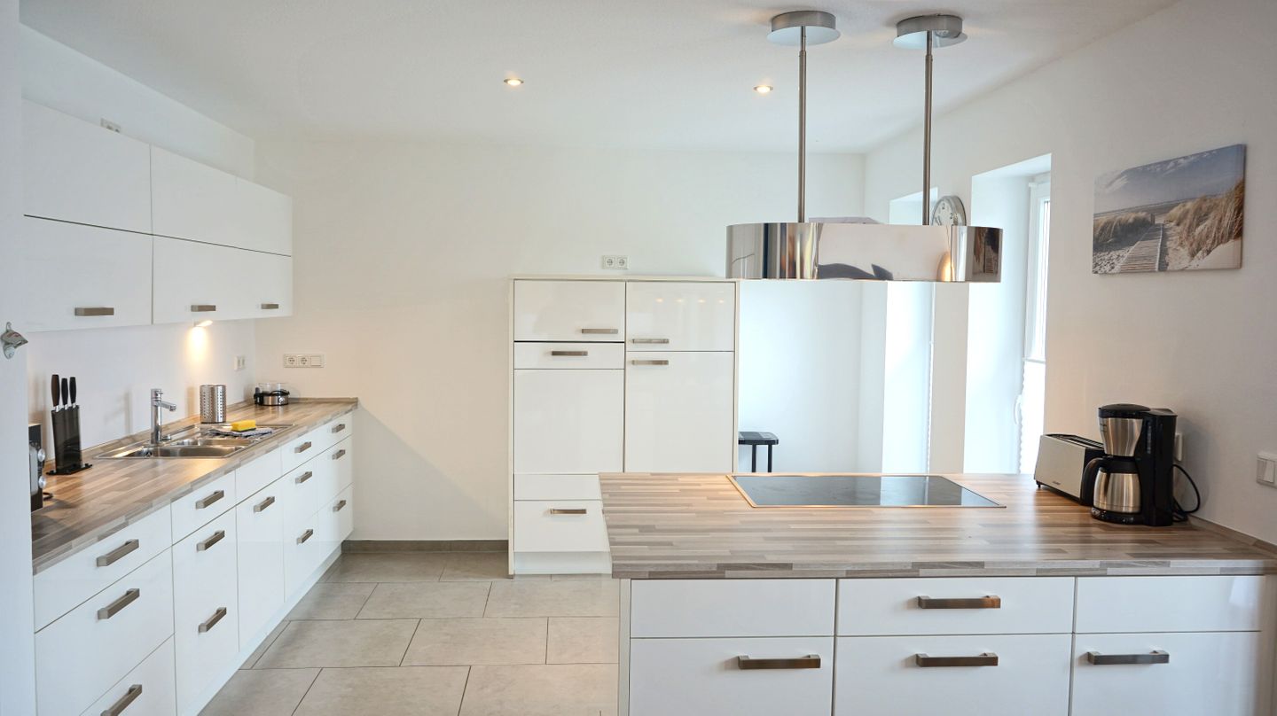 Die offene Küche ist zum Wohnzimmer hin gestaltet und vollständig für die Selbstversorgung ausgestattet. Ihnen stehen Herd, Backofen, Mikrowelle, Kühlschrank mit Gefrierfach, Spülmaschine, Kaffeemaschine, Wasserkocher, Toaster und Eierkocher zur Verfügung. Ergänzt wird die Ausstattung durch Küchenutensilien, Geschirrhandtücher sowie Abfalleimer. Eine Erstausstattung (Lappen,Schwamm, ein paar Geschirrspülmaschinentabs und Toilettenpapier ist ebenfalls vorhanden, was die Anreise erleichtert.