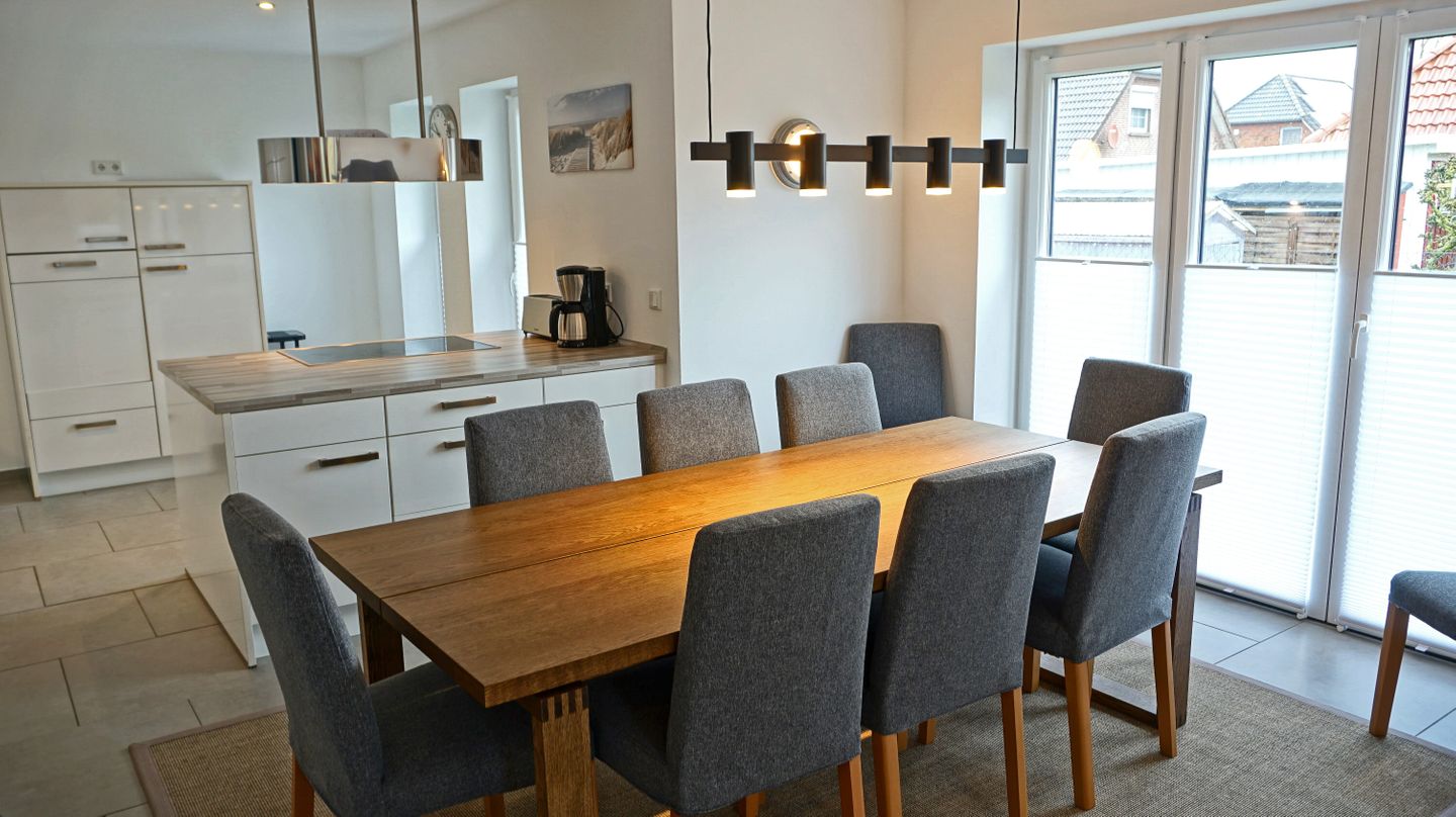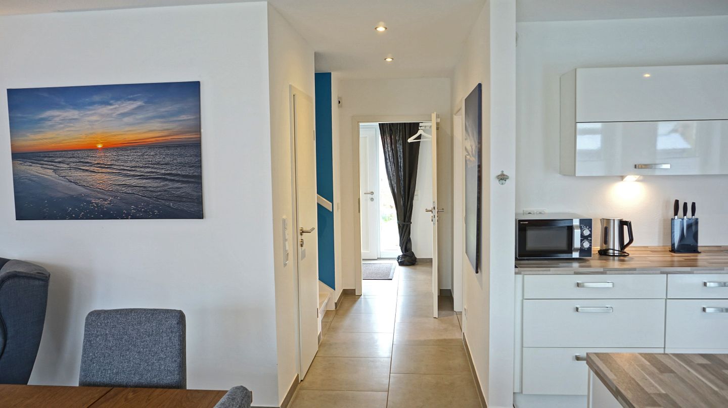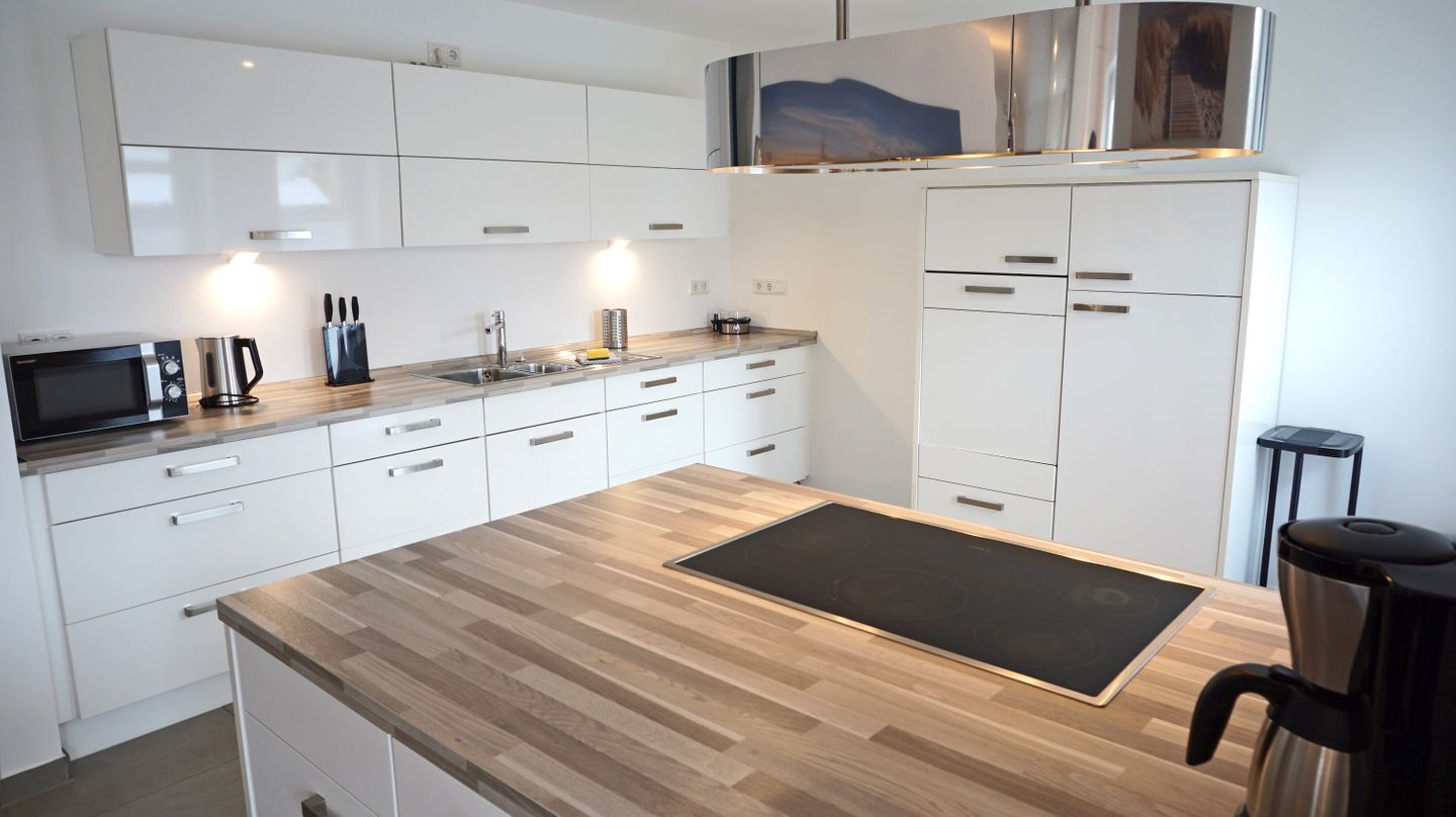 Die offene Küche ist zum Wohnzimmer hin gestaltet und vollständig für die Selbstversorgung ausgestattet. Ihnen stehen Herd, Backofen, Mikrowelle, Kühlschrank mit Gefrierfach, Spülmaschine, Kaffeemaschine, Wasserkocher, Toaster und Eierkocher zur Verfügung. Ergänzt wird die Ausstattung durch Küchenutensilien, Geschirrhandtücher sowie Abfalleimer. Eine Erstausstattung (Lappen,Schwamm, ein paar Geschirrspülmaschinentabs und Toilettenpapier ist ebenfalls vorhanden, was die Anreise erleichtert.