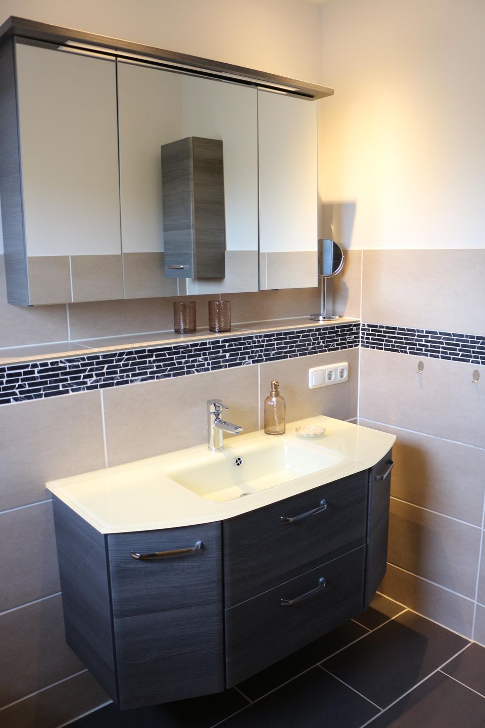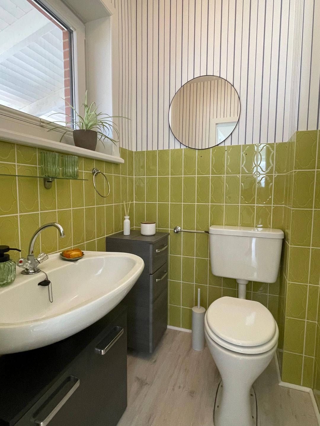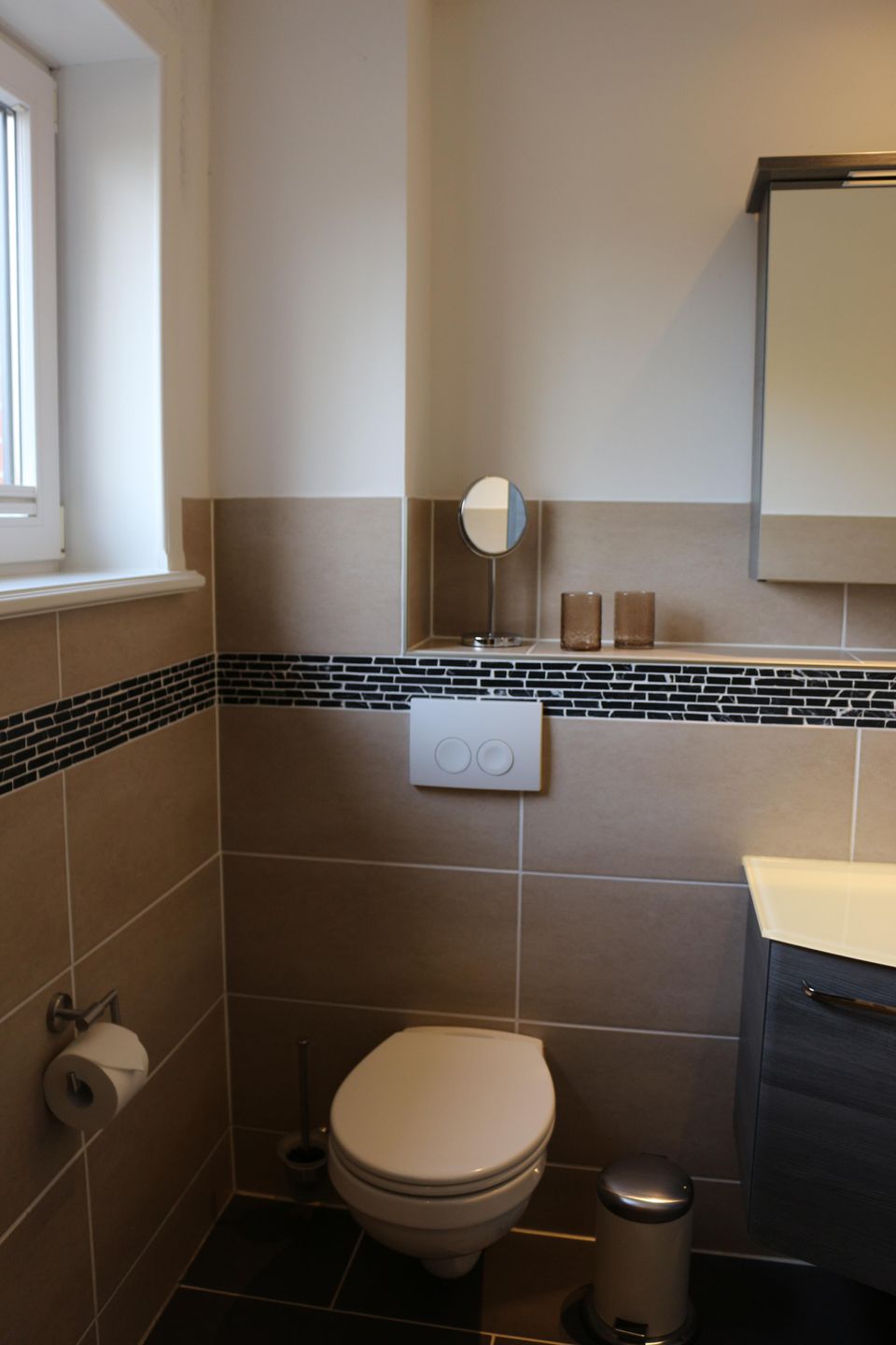 Im Bad erwarten Sie Dusche, WC, Waschbecken, Spiegel, Kosmetikspiegel und Haartrockner.