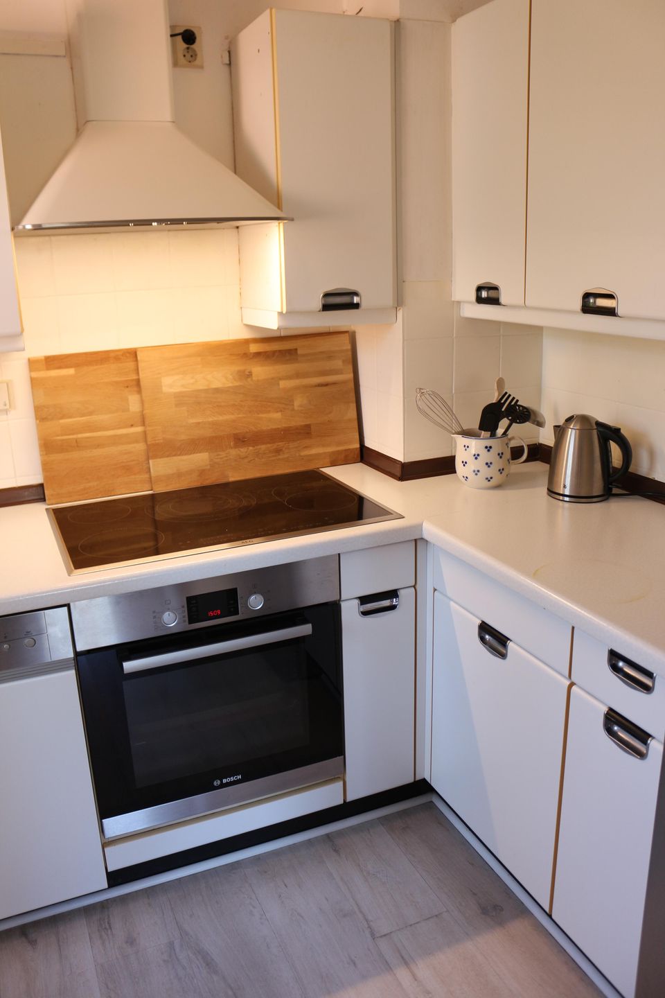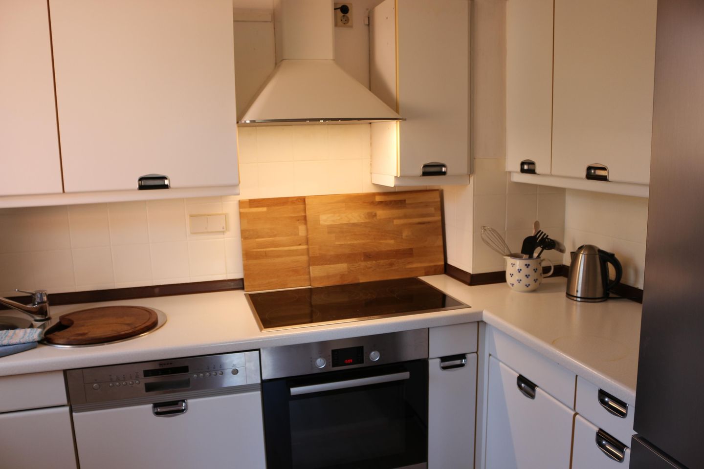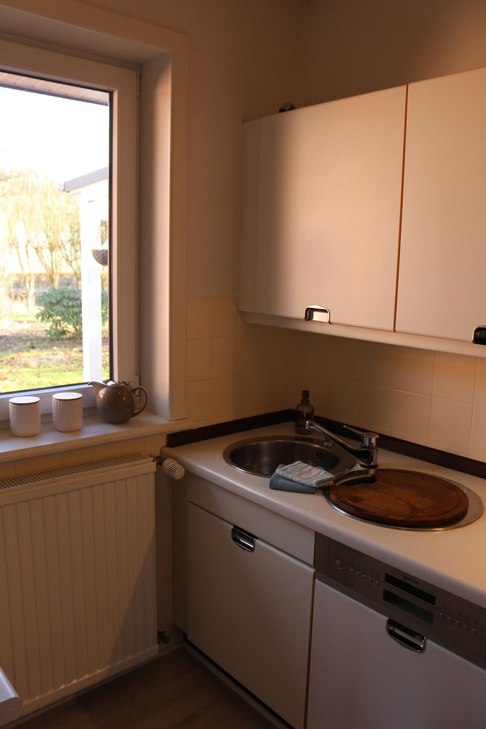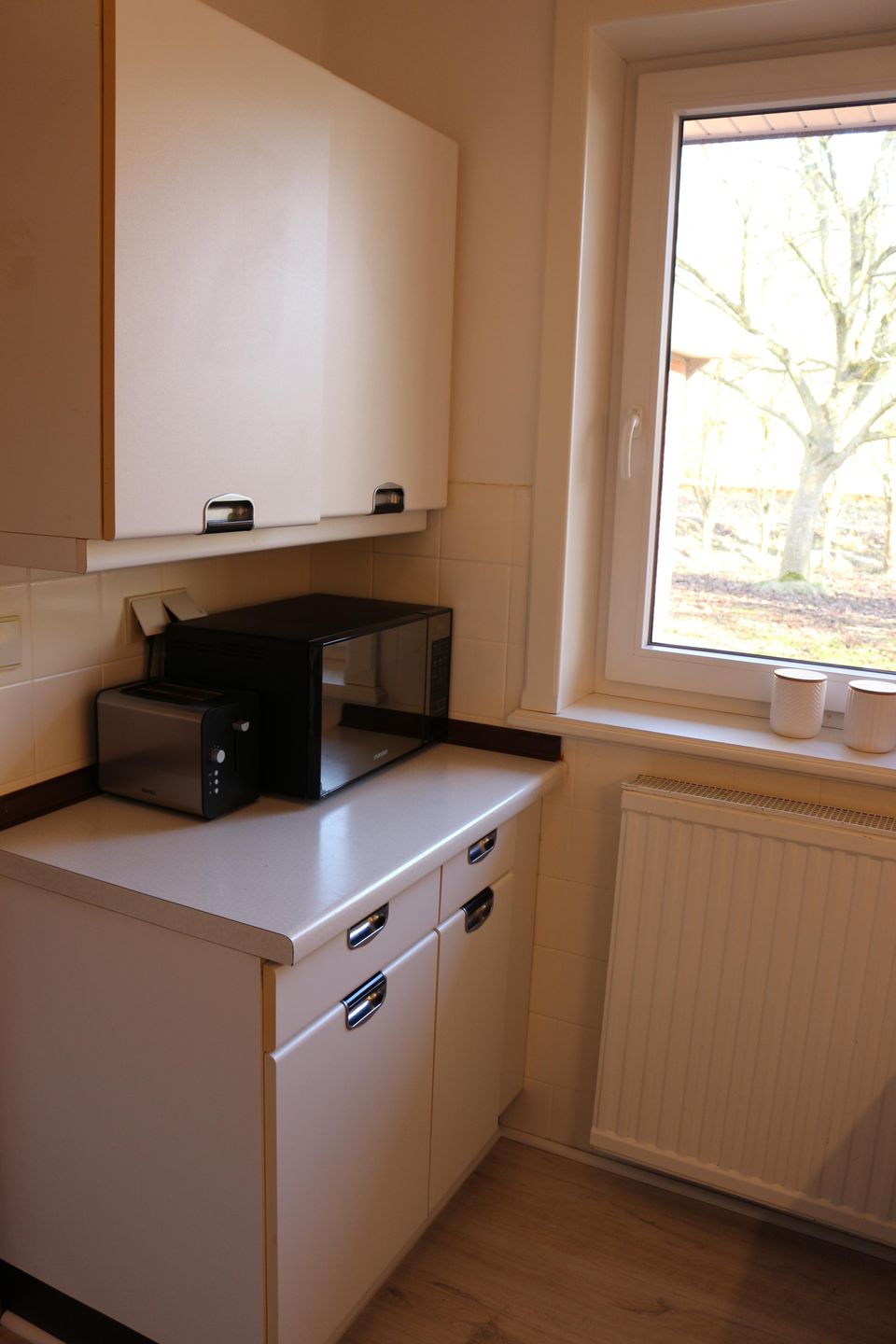 Die Küche ist voll ausgestattet und auf Selbstversorgung ausgelegt: Ceranherd, Backofen (Elektroanschluss), Mikrowelle, Kühlschrank mit Gefrierfach, Spülmaschine sowie Kaffeemaschine, Wasserkocher und Toaster. Küchenutensilien, ebenso eine Erstausstattung. Für längere Aufenthalte oder Familien praktisch: Waschmaschine (zur Eigennutzung), Bügelbrett, Bügeleisen und Wäscheständer.