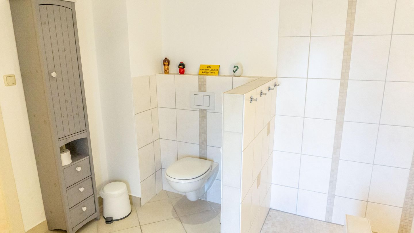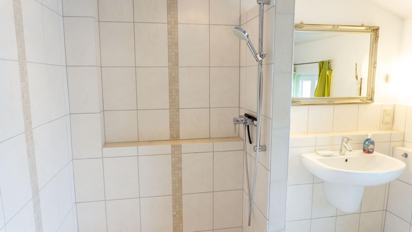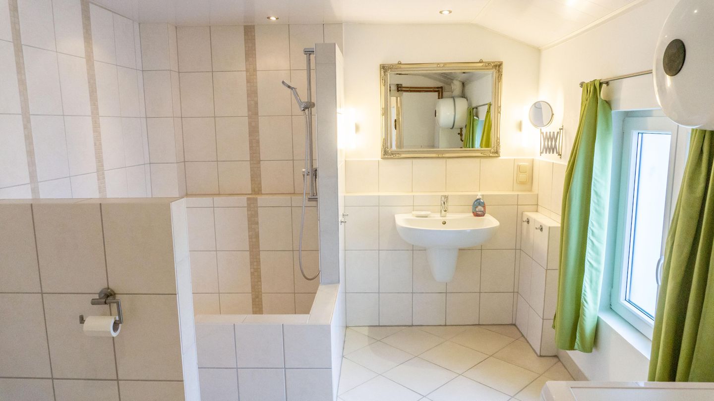 Das Badezimmer im Erdgeschoß ist funktional gestaltet und verfügt über eine bodengleiche Dusche, WC, Waschbecken, Haartrockner, Kosmetikspiegel und Fenster. Hier finden Sie außerdem eine Waschmaschine zur Eigennutzung.