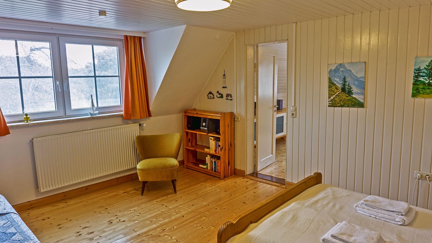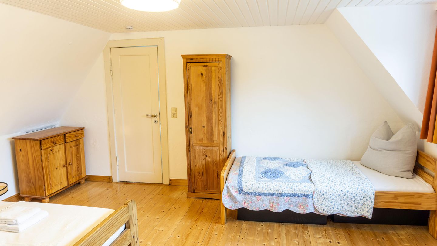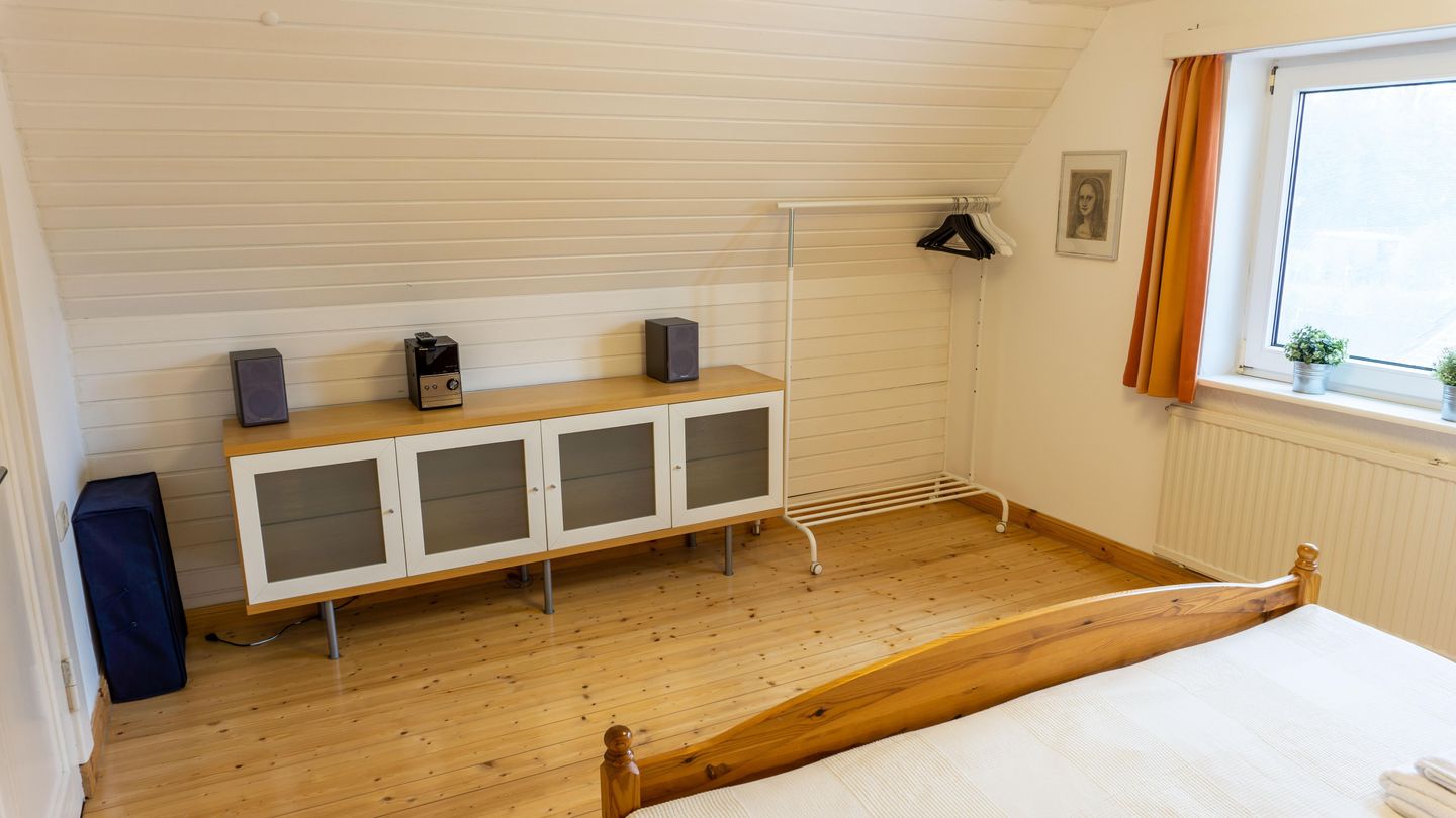 Mit zwei einladenden Schlafzimmern und insgesamt bis zu fünf Schlafmöglichkeiten (4 Erw., 1 Kind) finden sowohl Familien als auch Paare ausreichend Platz und Komfort für gelungene Urlaubstage. Das hintere Hauptschlafzimmer mit Doppelbett (200x180cm) im OG ist nur durch das vordere 2. Schlafzimmer mit Doppelbett (140x180cm) und einem Einzelbett (200x90cm) erreichbar.