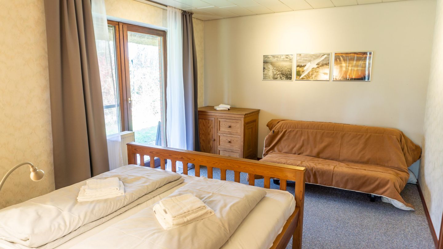 Schlafzimmer mit Doppelbett und Blick in den Garten und zusätzlichem Lignet Roset Schlafsofa, Kleiderschrank.